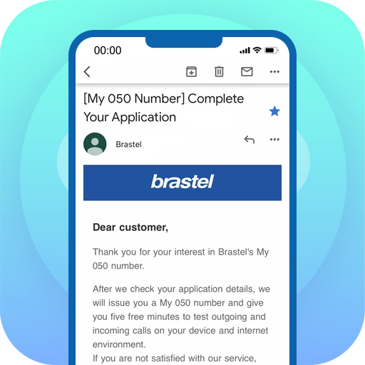 หลังจากที่บริษัทได้ตรวจสอบการสมัครของคุณแล้ว บรัสเทลจะออกหมายเลข My 050 คุณจะได้รับรายละเอียดสัญญาทางอีเมล นอกจากนี้ได้รับนาทีโทรฟรี 5 นาที เพื่อให้ทดสอบการโทรเข้าและโทรออกกับเครื่องปลายทางและสภาพแวดล้อมอินเทอร์เน็ตของคุณ